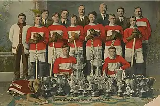Cross, third standing redshirted player from left, with the Moncton Victorias in 1912–13.