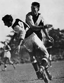 An oft-reproduced 1949 photograph of Dyer appearing to "decapitate" St Kilda's Tom Meehan