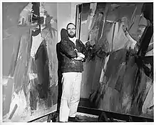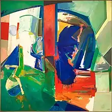 Following his travels, Wolfe returned to Massachusetts, where he supported himself both through his artwork and with several different jobs, including working as a truck driver, carpenter, and laborer. He even designed silverware chests and at one point worked as a restorer alongside artist Gustav Klimann.[15] In a review of his first solo show, a critic wrote: "It seems odd that such sensitive work is done by a painter who must spend part time driving a truck."[16] Wolfe began to become associated with a group of artists known as the Boston Expressionists.[17] His work combined abstract expressionist, cubist and hard-edge techniques,[18][19] often exploring geometry and depth with a highly saturated and unusual color palette.[20][21] In addition to abstract works, he was equally interested in portraiture, and painted many portraits from life.[22] His portraiture was shown in a well-received joint exhibition with Elaine de Kooning in 1965.[18]