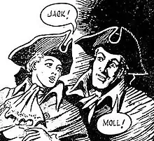 The new direction - which included being renamed Radio Fun and Adventures - was not enough to save the comic, though, and in February 1961 it was the first of many titles to be merged into Buster, with "Jack o' Justice" not among the features which was continued.[7] However, a year later the new management were putting together the new boys' comic Valiant and the modified Turpin reprints continued within, with Moll returning to her original name.[8] Despite their old-fashioned art contrasting with the more modern styles used on the likes of "The Steel Claw", the strip was highly popular with readers - so much so that when the Turpin/Moonlight strips ran out an attempt was made to continue them with more heavily redrawn reprints of "Claude Duval" from Comet before all-new material was commissioned in 1964, with Tom Kerr as primary artist and a turn towards supernatural-tinged mystery.[9][10][4] These strips introduced recurring villain Silas Loring and were a success, running until 1966 - when they were replaced by "Jack Justice", which established that Moll had made an honest man of Jack o' Justice, and followed their present-day detective descendant and his own alliterative accomplice Diana Dauntless until 1967.[11]