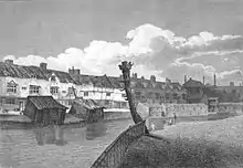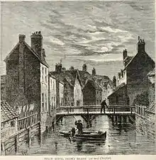 In the 1840s it became "a site of radical activity",[3] and, after attention from novelists Charles Dickens and Charles Kingsley, joined other London areas of "literary-criminal notoriety" that emerged "as symbols of a developing urban counterculture".[4] The 19th century social researcher Henry Mayhew described Jacob's Island as a "pest island" with "literally the smell of a graveyard" and "crazy and rotten bridges" crossing the tidal ditches, with drains from houses discharging directly into them, and the water harbouring masses of rotting weed, animal carcasses and dead fish.[5] He describes the water being "as red as blood" in some parts, as a result of pollutant tanning agents from the leather dressers in the area.[5][6]