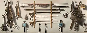 By the middle of the 17th century hunting still lifes had become very popular in the Dutch Republic. As an increasing number of Dutch people had become prosperous, they wished to display in their sumptuous country houses hunting still lifes, which expressed their high social status even though Dutch burghers were not allowed to hunt unless they were of the nobility.[4]
