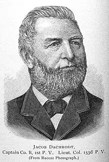 Jacob Dachrodt was an American Civil War hero who served as the captain of the 1st Pennsylvania Infantry Regiment's Company B during the Battle of Gettysburg. Following his reenlistment with the 153rd Pennsylvania Infantry Regiment, he was subsequently commissioned as the regiment's lieutenant colonel.[1][2]