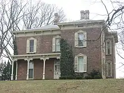 With the coming of multiple railroad lines, Washington Court House became an increasingly important center of commerce in the third quarter of the nineteenth century. Among those attracted to the city was Jacob Light, a tailor who had established himself as a regional merchant. Light purchased from Mills Gardner a sizeable lot south of the city's downtown on 10 May 1875, and by the beginning of June, he had commenced the construction of the present house.[2] Built of brick on a stone foundation and covered with a slate roof,[3] the L-shaped house is a distinctive example of the Italianate style. Among its prominent architectural components are the shallow hip roof, the front porch and its handcarven support beams, the shutters and pediments of the windows, and the brackets supporting the cornice. Particularly significant are the porch supports, which demonstrate the extent to which local woodcarving had progressed during the nineteenth century.[2]