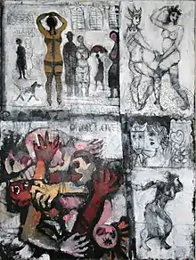 In February 1989, after a long period in which he did not show his work, an exhibition summarizing the last and most personal stage of his work was mounted at Beit Meirov Gallery in Holon. Wexler called them "Paintings Not For Sale." Many of them incorporated subjects marking the years he spent in Germany – clowns, acrobats, magicians, and prostitutes, alongside quotes from The Threepenny Opera. In her article "Brechtian Circus," critic Dorit Kedar described the recent shift in his work: "The viewer encounters, much to his astonishment, a highly concentrated circus. […] Wexler’s circus is Brechtian […] an admixture of the lightness of sketches and the aggressiveness of splashes of color, skipping between a figurative language and treatment of the canvas, which is absolutely contemporary in its abstract perception."[11]