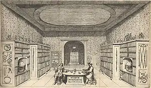 His collection drew the interest of the Russian tsar Peter the Great, who visited de Wilde's home on 13 December 1697 (the eve of de Wilde's birthday[6]) during his "Grand Embassy" of Western Europe.[lower-alpha 2] De Wilde's daughter Maria made an engraving of the meeting between Peter and her father, providing visual evidence of "the beginning of the West European classical tradition in Russia",[12] which she presented to Peter on his second visit, on the same date in 1717.[6] In the engraving, two men sit facing each other across a table surrounded by book cases and scientific instruments (de Wilde was proud of his interest in and experience with astronomy[6]); the tsar, on the right, can be identified by the double-headed eagle at his feet, an element of the coat of arms of Russia.[12] In back is a "cabinet/altar".[13] Scotsman Robert Erskine (1677—1718), chief physician and adviser to Peter the Great, studied de Wilde's collection (and many others) in the planning and design of the tsar's Kunstkamera.[13] The Alsatian Johann Daniel Schumacher, Erskine's secretary and court librarian in Saint Petersburg, visited the collection in 1721, reportedly a few months after de Wilde's death.[3]