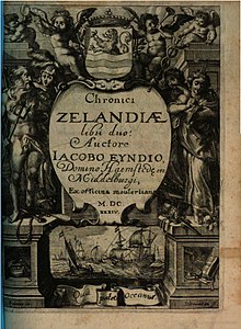 The 1634 edition of the Chronici includes a 22-page foreword, with a dedication to the State of Zeeland and acknowledgments to the editor Jean de Brune and the printer Simon Moulert; a few poems in honor of the author, and a very short preface. The first book, which ends at page 131 in the first edition, deals with the "antiquities of Zeeland." The first book is very poetical, esoteric, seldom glossing the facts, and Eyndius presents the reader with "but a few citations, hors d'oeuvre, conjectures, and enigmas."[1] He is more concrete in the second book, where, however, his style is still "vague and harsh," and the author seems to be imitating Tacitus.[1] In this work, Eyndius debunked some myths regarding the Dutch counts. On the other hand, he also made up some myths for Zeeland, such as that the pillars of Hercules were to be found there.[5] Eyndius' work of demythologization was followed by such great names in Dutch historiography as Petrus Scriverius (1576-1660), Jan Uytenhage de Mist (1636-1668), and Simon van Leeuwen (1626-1682).[5]