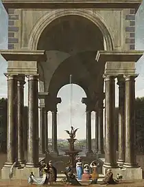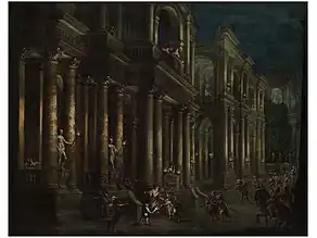 Some of Saey's architectural scenes appear to represent subjects from mythology or the bible while others may simply represent some entertainment or story involving fantastic figures imagined by the artist.[10] For example, his Baroque palace with Hermes delivering a message (at Dorotheum sale of 12 December 2011, Vienna, lot 25) depicts a mythological scene while his Solomon and the Queen of Sheba (Lempertz sale of 20 May 2017, Cologne, lot 1103) depicts a biblical scene.[11][12] Some works appear to be related to the extraordinary events in the life of Cleopatra. This could be the case with the Picnic in a palace courtyard (At Jean Moust in 2018), which possibly depicts a picnic of Cleopatra and Mark Antony.[4] Other works, such as the Perspective view of an Italian palace animated with figures and gallant celebrations (possibly 1690, Musee des beaux-arts de Valenciennes), do not appear to depict a specific story. The picture shows elegant figures on a terrace before a palatial building watching a dance performance by a black dancer holding a red macaw with open wings on his arm. He holds two dogs on a leash who appear to be running in step. Two musicians are playing string instruments on the terrace on the right while the spectators are sitting underneath a balustrade on the right.[13]