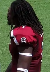 Clowney was also on the school's track & field team, where he competed as a sprinter, shot putter and discus thrower. He took ninth in the 100 meters at the 2011 York County Championships, with a career-best time of 11.43 seconds.[19] He recorded a personal-best throw of 14.82 meters in the shot put at the 2011 State Championships,[20] and also ran the fourth leg on the 4 × 100 meter relay squad, helping them earn a third-place finish at 42.86 seconds.[21]