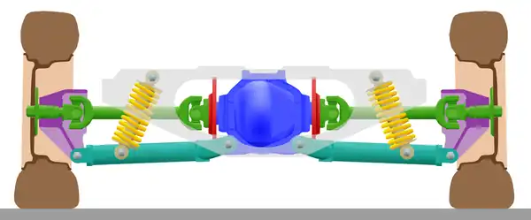 [4] The complete rear suspension assembly is carried in a steel crossbeam cradle (shown ghosted in the diagram below), which is attached to the vehicle body via four rubber vee-blocks and also carries the differential (blue) and inboard brakes (red). The rear wheels are located transversely by top links and wheel carriers (green) and lower links (cyan). The top link is the driving half-shaft with a universal joint at each end. The lower link pivots adjacent to the differential casing at its inboard end and where it meets the wheel carrier at the wheel hub casting (violet) at its outboard end. The pivot bearings at each end of the lower link are widely spaced so as to provide maximum longitudinal rigidity. Suspension is provided by two coil spring and damper units (yellow) on each side of the differential casing (four in total), the spring and damper units attaching to the crossbeam at the top and the lower link at the bottom. The lower links are further located longitudially by two radius arms (see photo above), each of which runs forward from the outer lower link to a point on the vehicle body, and is pivoted at each end via rubber bushings.