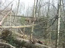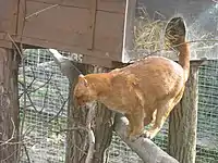 The jaguarundi is shy and reclusive, and apparently very cautious of traps.[45] There have been only a few radio telemetry studies of jaguarundis in Belize, Brazil and Mexico.[35] Though activity has been observed throughout the day and at night, jaguarundis seem to prefer hunting during daytime and evening hours; for instance, a study in Belize reported that jaguarundis started moving before dawn and remained active through most of the day till sunset with a peak in hunting from late morning to noon.[10][47] The cat appears to be more diurnal than most other cats, especially spotted cats that tend to be more active at night.[36][34] The jaguarundi can swim across medium-sized rivers; one in Bolivia was recorded swimming across the Tuichi River.[35] Jaguarundis are efficient climbers as well, but hunt mainly on ground; the coat color works as a good camouflage for terrestrial activity.[36] They can leap up to 2 m (6 ft 7 in) into the air to catch birds.[34] Predators recorded for jaguarundis include boa constrictors, cougars and domestic dogs.[35] Parasites such as hookworms (Ancylostoma species), tapeworms (such as Spirometra and Toxocara species) and the lung fluke have been found in jaguarundis.[10]