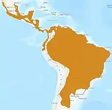 The range extends from central Argentina in the south to northern Mexico, through Central and South America east of the Andes — second only to the cougar in the latitudinal extent of its distribution. However, not all parts of its range have been studied well. The jaguarundi is fairly common in Brazil, Peru, and Venezuela.[42] It is possibly extirpated in the United States;[1] a 1999 study refuted claims of sightings in Arizona, in the Huachuca Mountains in Santa Cruz County.[43][44] The last confirmed sighting in the U.S. was of a roadkilled individual near Brownsville, Texas in 1986.[42]