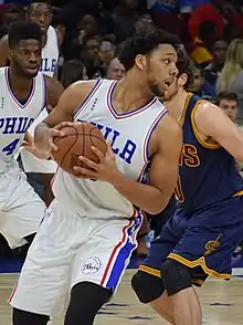 On June 25, 2015, Okafor was selected with the third overall pick in the 2015 NBA draft by the Philadelphia 76ers.[131] After debuting with a 20-point NBA Summer League performance on July 6, Okafor signed a two-year contract with the 76ers on July 7, with team options for two additional seasons.[132][133] He debuted for the 76ers, logging 26 points, 7 rebounds and two blocks, against the Boston Celtics on October 28.[134][135][136] On November 9, he posted his first career double-double with 21 points and 15 rebounds against his hometown Chicago Bulls.[137]