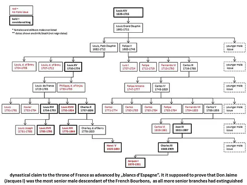 On 18 July 1909 Jaime succeeded his father as Carlist pretender to the throne of Spain and likewise inherited the Legitimist claim to the throne of France. As Carlist pretender to Spain he was known as Jaime III, but used the style Duke of Madrid. As holder Legitimist claim to France by so-called Blancs d'Espagne he was consider to be Jacques I, but often referred to as Duke of Anjou.