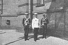 Following outbreak of the Boxer Rebellion Don Jaime travelled to St. Petersburg to request permission to join the imperial troops. During a personal meeting the tsar Nicholas II consented but asked him to be careful, as his life belonged "not only to him, but also to his country".[101] In mid-August 1900 Don Jaime left Warsaw for Odessa;[102] he then boarded a Russian military transport ship which took him to Port Arthur,[103] where he joined a Russian contingent[104] He was assigned to the corps of general Konstantin Tserpitsky, whose troops in September advanced in north-eastern China towards the Shanhai Pass. There is almost no verifiable information on Don Jaime's service and some details available look dubious.[105] A hagiographic biography provides conflicting information; on the one hand it suggests that Don Jaime served as Tserpitsky's aide-de-camp,[106] on the other, that he led two Russian companies during a charge[107] or headed reinforcements which came to rescue of a beleaguered French unit.[108]