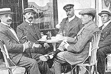 As an ardent motorist Don Jaime normally moved in automobile, either his own or this of his closest companion,[200] a Basque engineer and entrepreneur Martín Gaytan de Ayala y Aguirrebengoa;[201] initially a former conservative deputy Esteban Ruiz Mantilla was also listed as his associate.[202] He travelled low-profile and tried to maintain incognito; he did not give interviews and did not attend banquets or other official events. Information on his trips usually leaked to the press afterwards and was subject to endless speculations, confirmations and denials. Government officials used to dismiss the issue as irrelevant,[203] though occasionally left-wing press agonized about a dangerous subversive who comes and goes "como Pedro por su casa".[204] At times he was ridiculed with ironic couplets.[205] When in Spain, Don Jaime dedicated most of his time to leisure: sightseeing, theatres, restaurants and bullfights, which he greatly enjoyed.[206] However, he also used to meet local Carlist leaders. In most cases these were meetings in private, as Don Jaime was careful not to test the patience of the government. There were exceptions, though; in June 1908 he took part in large Carlist rallies in Somorrostro[207] and Zumarraga; just in case, he returned to France the same day.[208]
