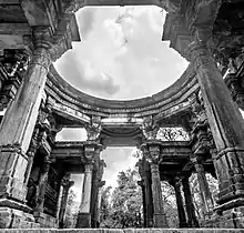 The Lakhena Jain temple or Lakhena na Dera is the largest temple in Abhapur. The temple is rich in architecture with exquisite sculptures of apsara. The temple also has a well in the premise.[1] The lower level chamber where idols were concealed in the past.[5] The temple is made of sandstone with well carved ceiling and jalis in the mandapa having various natural and geometric patterns. Only the arch remains where a main dome exited in the past. The temple is two storeyed with gudhamandapa and antarala. The antarala ceiling has a beautiful sculpture. The temple has beautifully executed screens, swan panels, and other carvings and the richly carved pillars have carvings comparable to the Dilwara Temples. The doors in the garbhagriha has carving similar to that of wooden door. The mulnayak of the temple is an image of Jain Tirthankara Parshvanatha with Goddess Padmavati on the sides. The temple is 150 by 70 feet (46 by 21 m) in area. The temple was formerly surrounded by 52 devkulika shrines.[3][4]