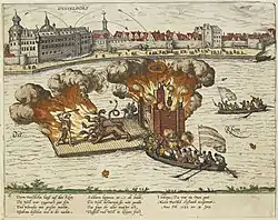 When William died in 1592, John William inherited the duchies and Jakobea tried to rule on behalf of her husband, who had been locked up because of his temper tantrums. She had been born a Protestant, but was raised as a Roman Catholic and did not choose for either side. She never became pregnant, possibly because her husband was impotent. She had a relationship with the much younger Dietrich von Hall zu Ophoven,[1] who was Amtmann at Monheim am Rhein and was eventually arrested and locked up in the tower of Düsseldorf Castle.[2] She tried to plead her case in the Roman Rota and at the imperial court in Prague, but the case made little progress. The Catholic side, represented primarily by her sister-in-law Sibylle of Jülich-Cleves-Berg, then took matters into their own hands.