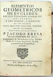 In order to make the study of mathematics easier for the Spanish students, Kresa translated the 8 books of Euclid's Elements into Spanish. This brought him recognition and he soon became renowned in the whole country, being dubbed the Euclid of the West. At that time it became a custom in Spain to let Kresa assess mathematical treatises ahead of publication.[1] Apart from the Colegio Imperial de Madrid, Kresa was also giving lectures at the Naval academy of Cadiz.[2]
