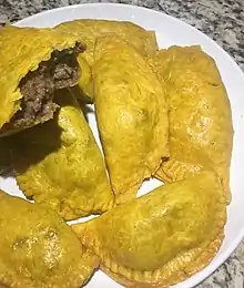A Jamaican patty is a semicircular pastry that contains various fillings and spices baked inside a flaky shell, often tinted golden yellow with an egg yolk mixture or turmeric.[1] It is made like a turnover as it is formed by folding the circular dough cutout over the chosen filling, but is more savoury and filled with ground meat.[1]