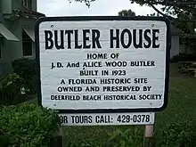 The James D. and Alice Butler House, commonly known as the Butler House, is a historic house museum in Deerfield Beach, Florida. It is located at 380 East Hillsboro Boulevard. On July 28, 1995, it was added to the U.S. National Register of Historic Places.[2]