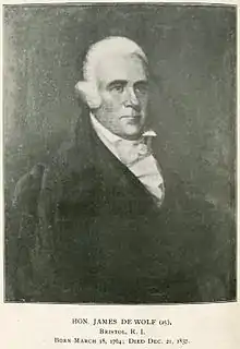 James DeWolf (March 18, 1764  December 21, 1837) was a slave trader, a privateer during the War of 1812, and a state and national politician. He served as a state legislator for a total of nearly 25 years, and in the 1820s as a United States senator from Rhode Island for much of a term. Along with the slave trade, DeWolf invested in sugar and coffee plantations in Cuba and became the wealthiest man in his state. By the end of his life, he was said to be the second-richest person in the entire United States. During his lifetime, his name was usually written "James D'Wolf".