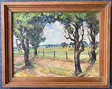 In 2021, the Neosho Arts Council sponsored a lecture on Duard Marshall and an exhibition of his work at the Neosho Newton County Library, which houses Marshall's 1939 Neosho centennial mural.[20] Guest speaker Daniel Paul Morrison discussed Marshall's biography and art career.[21] A total of seven works were exhibited (in addition to the centennial mural): one oil on canvas, "Missouri Landscape" (1938); two watercolors, "Colorado Landscape" (1940) and "Kansas Wheat Harvest" (1970); one lithograph, "Going Home (1946); two block prints, "Tourist in Munich" (1956) and "At Bat" (1971); and My Road, Marshall's 1941 handmade book with eight lithographs. This was the largest single public exhibition of Marshall's work since the 1940s. "Colorado Landscape" and My Road are part of the collection of the Longwell Museum at Crowder College. All other works are in private collections.