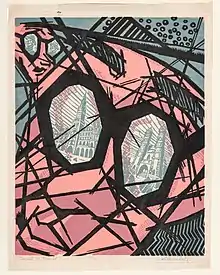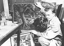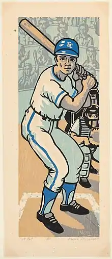 Marshall was very active exhibiting his work in the 1930s and 1940s. For example, he was represented in at least 10 shows in 1940. World War II did interrupt his art career, but following the war he became active in the Denver, Colorado, art scene, participating in the groundbreaking "15 Colorado Arts" show at the Denver Art Museum in 1948.[11] Marshall remained in Denver until 1952 after which he become the director of the Fort Worth (Texas) Children's Museum.[12] He also was an art instructor at Texas Wesleyan College (now Texas Wesleyan University). In 1954, Marshall took a two-year assignment to work for the United States Special Services Division in Germany, teaching art to soldiers of the US Army.[13] After his initial enlistment, Marshall remained in Germany until 1960. In 1956, Marshall exhibited his block print Tourist in Munich at the Knickerbocker Show at the National Arts Club in New York City and the Beaumont Art Museum, now called the Art Museum of Southeast Texas in Beaumont, Texas.[14][15] In 1960, Marshall returned to Kansas City to help Thomas Hart Benton prepare his mural "Independence and the Opening of the West" in the Truman Library.[16] Marshall also assisted Benton prepare his murals for the New York Power Authority.[17] Back in Kansas City, Marshal made his living doing art restoration, continuing to create art, but not exhibiting very often. In his last years, he went to live with his daughter in Lumberton, New Jersey, where he died in 2010.