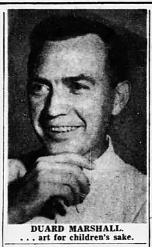 Marshall was born to James Claude Marshall and Bertha Dee Shipley in Springfield, Missouri. Marshall's father died in 1918 when Marshall was just four years old. After the death of his father, Marshall and his family moved to Fayetteville, Arkansas, his mother's hometown. His mother died in 1933 when Duard was 19. Marshall graduated from high school in Fayetteville, Arkansas, in 1933.[3] In 1934 and 1935, he worked for the Federal Emergency Relief Administration teaching art classes in Fayetteville.[4][5] In 1935, Marshall began to study art at the University of Arkansas with Elizabeth Galbraith, but in September 1935, he entered the Kansas City Art Institute to study with Thomas Hart Benton.[6] In 1937, Marshall married fellow KCAI student, Helen Mitchell of Neosho, Missouri.[7] He remained at KCAI for five years, graduating with a four-year certificate in May 1940. In the summer of 1940, Marshall studied with Boardman Robinson at the Colorado Springs Fine Arts Center, later part of Colorado College. Marshall returned to Colorado College, after a few years in government service during World War II, and finished his bachelor's degree at Colorado College in 1945.[8] Marshall's only child was born in Neosho, Missouri in 1945.[9] In 1951, Marshall and his wife Helen divorced and he was remarried to Bonnie L. Davis. Marshall and Davis remained married until her death in 2006. After completing his undergraduate work at Colorado College, Marshall enrolled at the University of Denver and completed his master's degree in 1951, with a thesis titled "Several Methods for Facilitating Drawing, Painting and Sculptural Art Expression."[10]