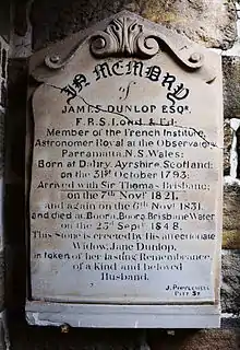 In April 1831, Dunlop was appointed superintendent of the Government observatory at Parramatta. He was selected mainly from his good knowledge of Colony and the observatory site, but the real reason for his selection was more because even though such an astronomical position was formally advertised, nobody applied for the astronomical tenure. Here he was to succeed Rümker with the reasonably good salary of £300 a year. He arrived at Sydney on 6 November 1831 and found the observatory in a deplorable condition; rain had entered the building, roofing plaster had fallen down, and many important records were destroyed. Dunlop succeeded in getting the building repaired and started on his work with energy, but around 1835 his health began to fail; he had no assistant, and the building, having been attacked by white ants, fell gradually into decay. In August 1847, he resigned his position, and went to live on his farm on Brisbane Waters, an arm of Broken Bay. He died on 22 September 1848. In 1816 Dunlop married his cousin Jean Service, who survived him. Dunlop was awarded medals for his work by the King of Denmark in 1833, and the Institut Royal de France in 1835. He was elected a fellow of the Royal Society of Edinburgh in 1832, his proposer being Sir Thomas Makdougall Brisbane.[2]