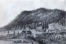 In 1849, Lieutenant Simpson made his first journey into the American west, during an expedition commanded by Colonel John James Abert. Simpson surveyed a road from Fort Smith, Arkansas to Santa Fe, New Mexico. This was followed by a punitive raid against the Navajo, under the command of John M. Washington. Simpson included sketches and artwork from the brothers Edward Kern and Richard Kern. Simpson then assumed responsibility as the Chief Topographical Engineer for the Ninth Military Department, based in Santa Fe.[1][2][3]