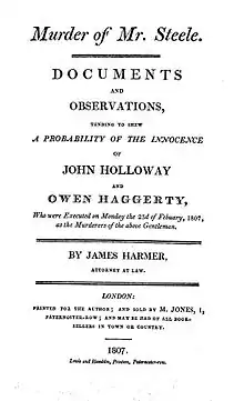 Harmer wrote pamphlets on behalf of Holloway and Haggerty in 1807, on the case of George Mathews in 1819, and in 1825 on behalf of Edward Harris.[2]
