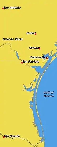 Hewetson and James Power partnered as empresarios in 1826 to establish a colony in Texas.[1] After forming the partnership, Power and Hewetson applied to be empresarios with the Mexican government in 1825 in order to begin a colony on the Texas coast with Mexican and Irish families. The original 1826 application requested a grant between the Nueces and Sabine Rivers, but in 1828, the Mexican government instead offered the strip of land between the Guadalupe and Lavaca Rivers. The next year, Power and Hewetson requested more land and their holdings were extended west to the Nueces River, which included Nuestra Señora del Refugio Mission. Ownership disputes with other empresarios forced Power and Hewetson to cede some land east of the Guadalupe River and the new eastern boundary was drawn at Coleto Creek.[2]