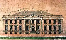 In July 1792, Hoban was named winner of the design competition for the White House.[8] His initial design resembled the Charlestown Courthouse with a three-story facade and nine bays across. Under Washington's influence, Hoban amended it to a two-story facade, 11 bays across, and, at Washington's insistence, the whole presidential mansion was faced with stone. It is unclear whether any of Hoban's surviving drawings are actually from the competition.[9]