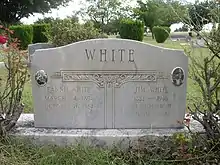 Jim White died on April 26, 1946, in a hospital in Carlsbad, New Mexico, at the age of 63.[7] He suffered from Bright's disease[2] and died of coronary thrombosis.[7] He told a reporter for the Carlsbad Current-Argus, two days before his death, that he felt well but was not ready to ride a horse to California, again.[7] He is buried alongside his wife, Fannie, at Carlsbad Municipal Cemetery in Carlsbad. The epitaph on his tombstone reads "The Discoverer of Carlsbad Caverns".[7]