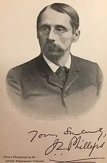 James Liddell Phillips (1840–1895) was a medical and religious missionary. Born in Balasore, India, Phillips always considered himself an "Indian boy."[1] His father, Jeremiah Phillips, was also a medical and religious missionary whose work inspired James. After his teen and young adult years, which he spent in America, he returned to India as a missionary, where he worked intensively with many tribes in Bengal, India, especially the Santal tribes.[2] He held medical clinics and sermons, ran a newspaper, founded the Bible School in Midnapore, and started many Sunday schools, to name a few of his accomplishments. Phillips died on June 25, 1895, in Mussoorie, India.[3] The last thing he wrote in his journal before his death was “May God bless the Sunday School message to the young!”[1]