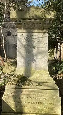He died on 1 September 1871 and was buried on the western side of Highgate Cemetery.
