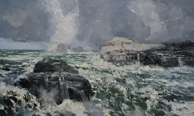 Cook's work has been described as an individualistic, unpretentious "balance of realism, abstract expressionism and impressionism"[24][10][25]—a designation somewhat borne out by artists he names as key influences: J. M. W. Turner, Manet, Monet, Willem de Kooning, Richard Diebenkorn, and Frank Auerbach.[26][12] Other writers situate his work in an American tradition that runs through 19th century Western landscape painters Albert Bierstadt and Frederick Church, the Winslow Homer's seascapes,[9] and George Luks and George Bellows, which Cook goes beyond with an unmistakably contemporary, unromantic perspective.[27][14][28]
