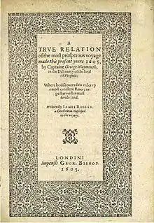 According to Quinn, there were three versions of Rosier's account of the voyage: a now-lost journal; a manuscript version obtained first by Hakluyt and then by Purchas, who abridged it in Purchas his Pilgrimes in 1624; and yet another manuscript, perhaps edited by Hakluyt, which was published as A True Relation of the most prosperous voyage made this present year by Captaine George Waymouth in the Discovery of the Land of Virginia: where he discovered 60 miles of a most excellent River; together with a most fertile land, (London, 1605).[5]