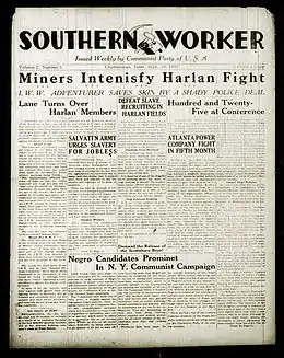 Allen's actual time spent in the South was limited, as he was forced to return to New York in 1931 by the pressure of life in hiding[9] and the "monotonous" and "depressing" job of editing an underground newspaper to which Southerners were too frightened to subscribe.[10] Allen remained a member of the Party's Southern District committee, however, and in that capacity, he played a prominent role in all of the party's major regional activities during the early 1930s: the organizing of Alabama sharecroppers, the Harlan, Kentucky miners' strike and the Scottsboro case.