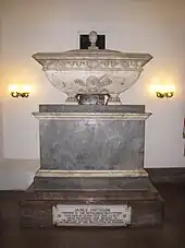 Smithson was buried in Sampierdarena, Genoa, Italy. The United States consul in Genoa was asked to maintain the grave site, with sponsorship for its maintenance coming from the Smithsonian Institution. Smithsonian Secretary Samuel P. Langley visited the site, contributing further money to maintain it and requested a plaque be designed for the grave site. Three plaques were created by William Ordway Partridge. One was placed at the grave site, a second at a Protestant chapel in Genoa, and the last was gifted to Pembroke College, Oxford. Only one of the plaques exists today. The plaque at the grave site was stolen and then replaced with a marble version. During World War II, the Protestant chapel was destroyed and the plaque was looted. A copy was eventually placed at the site in 1963.[27]