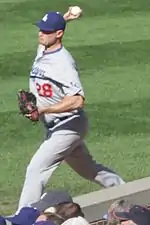 After the 2004 season, Wright became a free agent, but he resigned with the Rockies on December 22, 2004.[1] He spent most of the 2005 season in their rotation.[4] From June 4 through 16, he threw 14+1⁄3 straight scoreless innings.[4] After beating the Giants on August 2, Wright proceeded to lose his next five starts.[26] After Wright posted a 6–16 record and a 5.71 ERA, the Rockies moved him to the bullpen at the end of August to make room for Zach Day and Sunny Kim in Colorado's rotation. "This could be the beginning of the second half of my career, and I would like it to be here," Wright said of the move.[27][28] He was 8–16 with a 5.46 ERA in 34 appearances (27 starts) in 2005.[7] Wright's 16 losses were topped only by Kip Wells's 18 in the NL.[29] After the season, he became a free agent.[1]