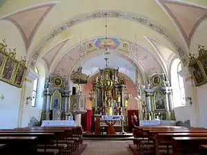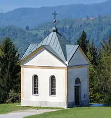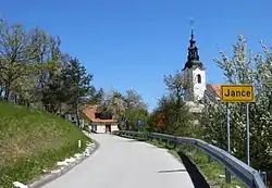 The local parish church is dedicated to Saint Nicholas and belongs to the Roman Catholic Archdiocese of Ljubljana. It was a 17th-century chapel to which a nave was added in the early 18th century and a belfry in 1830.[9] A chapel dedicated to Our Lady of Lourdes was built next to the church in 1897,[10] after the 1895 Ljubljana earthquake, which had its epicenter in the village.[8] The church originally belonged to the proto-parish of Šmartno pri Litiji, and was then part of the Parish of Prežganje. A vicariate was established in Janče in 1787, and it became a parish in 1805.[2]