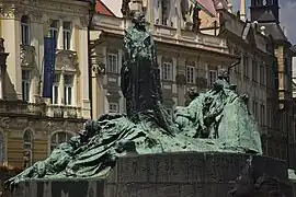 The Jan Hus Memorial (Czech: Pomník mistra Jana Husa) stands at one end of Old Town Square, Prague in the Czech Republic. The huge monument depicts victorious Hussite warriors and Protestants who were forced into exile 200 years after Hus in the wake of the lost Battle of the White Mountain during the Thirty Years' War, and a young mother who symbolises national rebirth.
