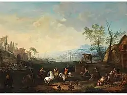Jan Peeter van Bredael the Elder was born into an artist family in Antwerp as a son of the landscape painter Peeter van Bredael and Anna Maria Veldener.[3] His father was known for his in market scenes and village feasts set in Italianate landscapes.[4] His mother was the daughter of the sculptor Jennyn Veldener.[5] His brothers Joris and Alexander also became painters.[2]