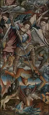 His earliest known painting is The birth of St. John the Baptist (circa 1515–1520, collection of the Carnegie Museum of Art in Pittsburgh). This early work shows the painter still struggling with his figures. The neatly painted Renaissance architectural details indicate the artist's interest in contemporary artistic developments in Italy. The result is a work rooted in the 15th century Flemish tradition of Early Netherlandish painting but with a focus on Italy and the mannerism of among others Bernard van Orley. His principal panel works are the monogrammed wings of a dismembered altarpiece depicting scenes from the New Testament stories of the Conversion of Saint Paul and The Fall of Simon the Magus (M – Museum Leuven) which are monumental and in a classicizing style.[5] Two wings of an altarpiece with Scenes from the Life and Martyrdom of Saints Catherine and Clement are in the St. Peter's Church in Leuven. It is not known whether the panels were originally attached to a central painted panel or to a sculpted retable.[8][9]