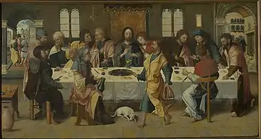 The only known extant work by Jan Willems is the Last supper dated 1524-25. This large panel painting of 94 cm high by 180 cm wide is now kept in the Saint Quentin's Church in Leuven. The painting was donated to the church around 1557 as a legacy by Adriaan van Blehem, one of the most important benefactors of Saint Quentin's Church.[3] The work reflects the growing influence of Renaissance ideas on painters in Leuven.[5] His style is in line with that of Antwerp mannerists such as the Master of 1518 and Pieter Coecke van Aelst.[1]