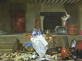 A Kitchen still life in a private collection in Hungary illustrates some of the compositional qualities of the artist. The painting shows a kitchen scene with a still life of game, food and kitchen utensils in the foreground and a large fireplace and two persons - apparently a female and male servant - at the back of the scene. The man is exiting through a door at the left while the woman has her hand on top of the ledge above the fireplace, possibly cleaning it. The still life's apparent disorder hides a compositional scheme based on triangles.[3]