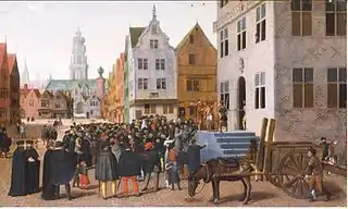 Jan van Wechelen painted a number of religious compositions. His Ecce Homo (Indianapolis Museum of Art) reprises a theme and setting that had become popular in Flemish art from the 15th century. Placing this subject matter of Jesus being shown to the people in a contemporary setting was not uncommon as is demonstrated by a work of Gillis Mostaert, which places the scene on the main square of Antwerp.[13] By staging the dramatic scene on the square of a Flemish town an accusation of sinfulness and culpability is directed at the contemporary crowd witnessing the event. That children also share culpability is implied by the prominent presence of children among the spectators. The cartload of crosses in the foreground on the right refers to the people's call for Christ's execution.[14]