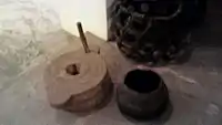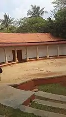 The first museum building in the complex is the Lokamatha Mandira where exhibits consist of various types of rural household items and agricultural tools. Right at the entrance to this building there is a very large grinding stone, which used to be operated by two buffaloes, and was put to use during marriage celebrations.[12] The household items of daily use by rural folk on display are cooking vessels, jars to store pickles, salt containers and serving utensils made of stone, wood and mud.[9][12] Brass and copper vessels used for worship, tools and tackles used for harvesting and climbing trees to pluck coconuts and areca nuts, large sized pots made of mud used for storing grains, old hand-looms are also exhibited here. The paintings in this museum hall are made from natural colours and these were part of marriage decorations in tribal houses; which is still a prevalent practice among many tribes, particularly pertain to the work culture of tribal women.[2]